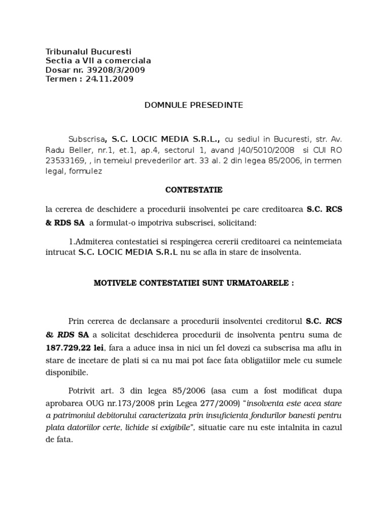 Locic Contestatie La Insolventa Cu Rcs Rds