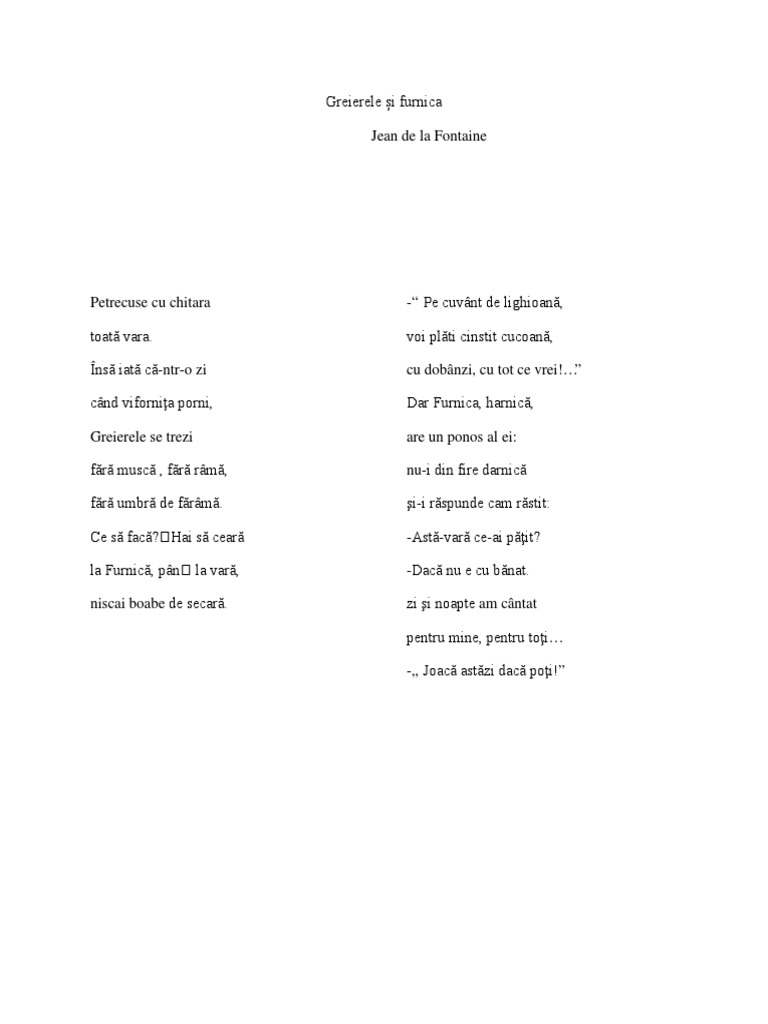 Greierele Si Furnica La Fontaine Comentariu